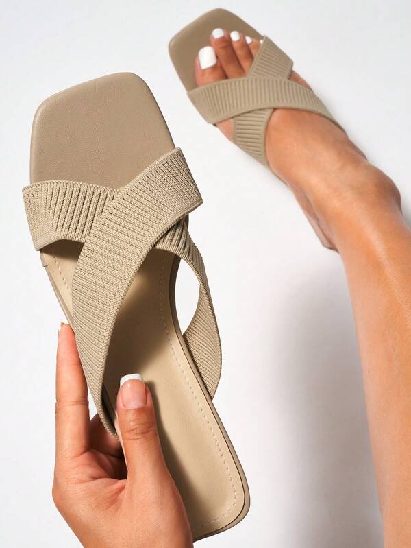 Women's Chunky/Medium Heel Mule Solid Color Peep Toe Cross Buckle Furry Woven Summer Breathable Casual High-Heeled Sandals