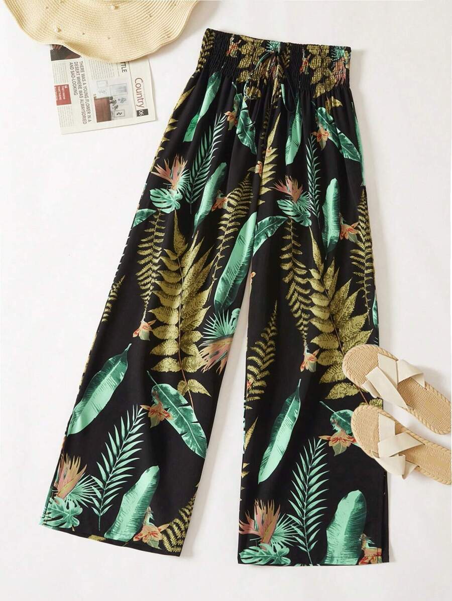 SHEIN VCAY Women's Elastic High Waist Wide Leg Pants With Leaf Print