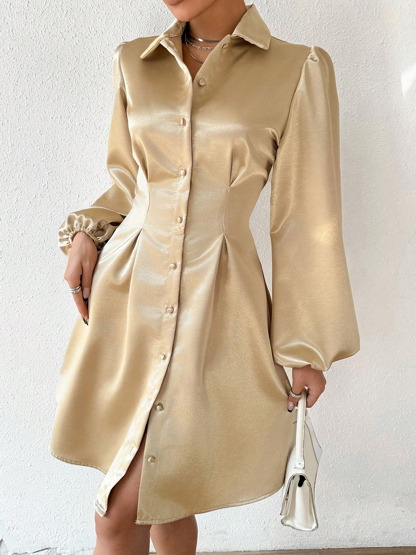 SHEIN Privé Women'S Elegant Waist-Tightening And Slimming Lantern Sleeve Shirt Dress