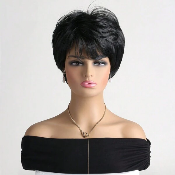 Women'S Fashionable 10 Inches Short Curly Synthetic Wig, Black Color, With Bangs, Suitable For Daily Wear