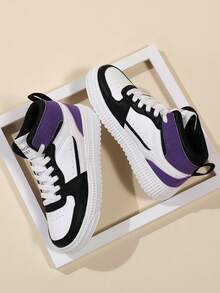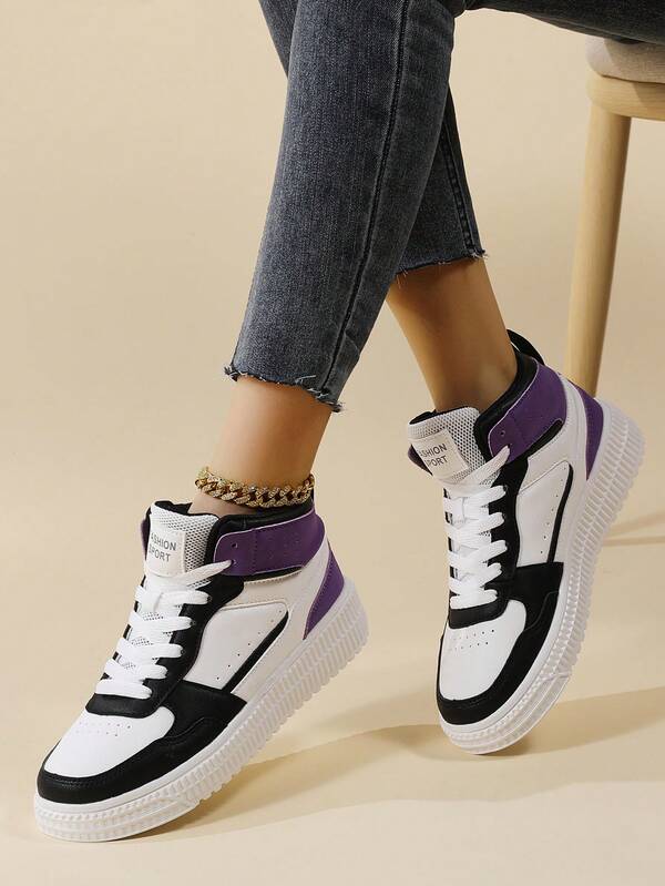 Women'S Fashionable High-Top Sports Shoes, Simple Color-Blocked Street-Styled Lace-Up Sneakers, Comfortable And Lightweight, Black & Purple Skate Shoes
