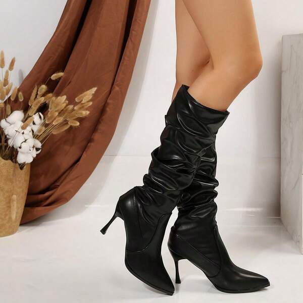 Women'S Fashionable Versatile Pleated Surface Pointed Toe Thin Heel Knee-High Boots