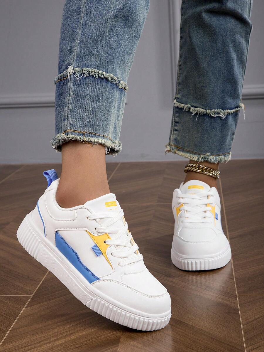 Women's Fashionable White & Blue Comfortable Lace-Up Athletic Shoes, Lightweight Sneakers