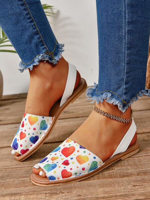 Women'S Fish Mouth Flat Sandals With Heart Shape And Irregular Colorful Print, Fashionable Beach Shoes