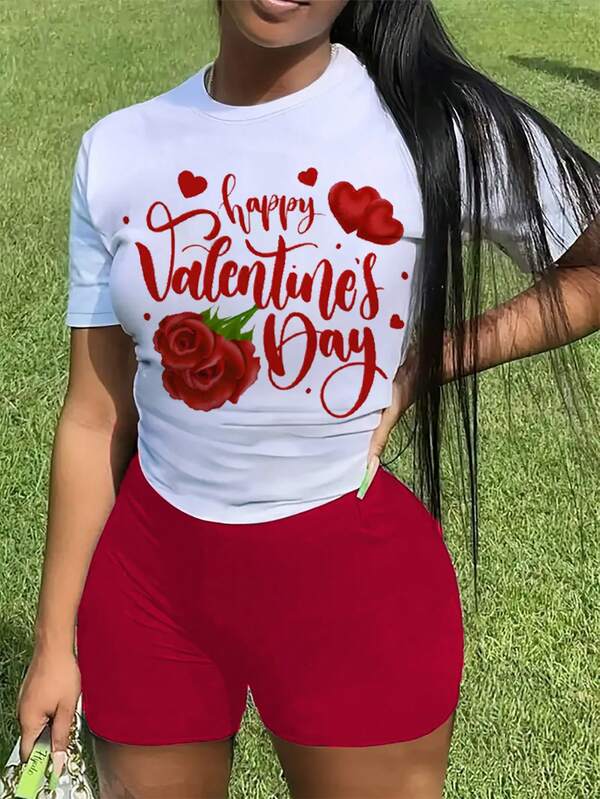 SHEIN Slayr Women'S Floral & Slogan Print Short Sleeve T-Shirt And Shorts Set