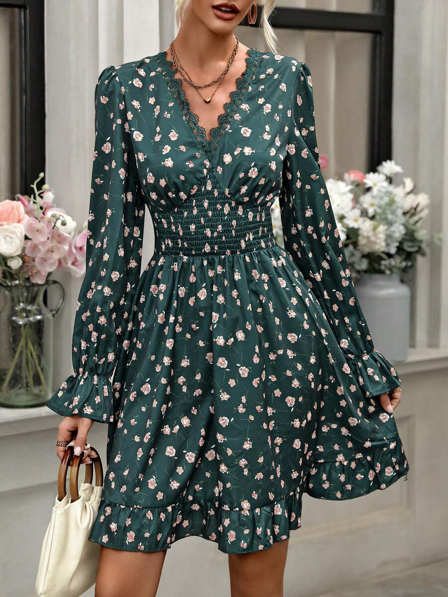SHEIN LUNE Women'S Floral Printed Layered Ruffle Sleeve Lace Patchwork Dress