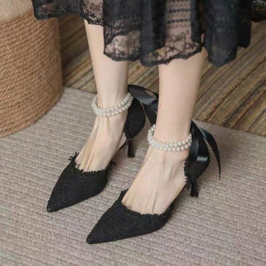 Women'S French Style New High Heels With Bowknot, Pointed Toe, Pearl Chain, Sweet-Breathed Sandales Lucky Bridal Shoes
