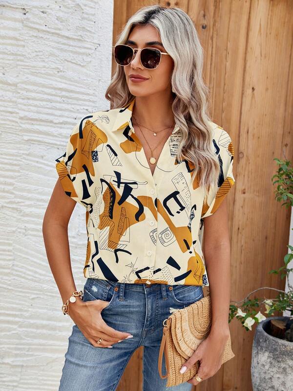 SHEIN LUNE Women'S Geometric Printed Batwing Sleeve Blouse
