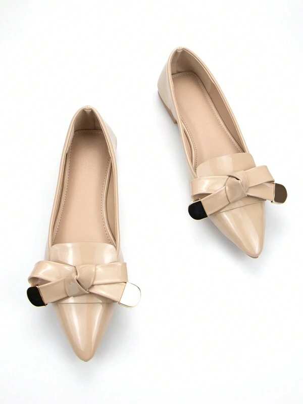 Women'S Gold-Tone Hardware Buckled Bowknot Decoration Pointed Toe Daily Flats In Apricot Patent Leather