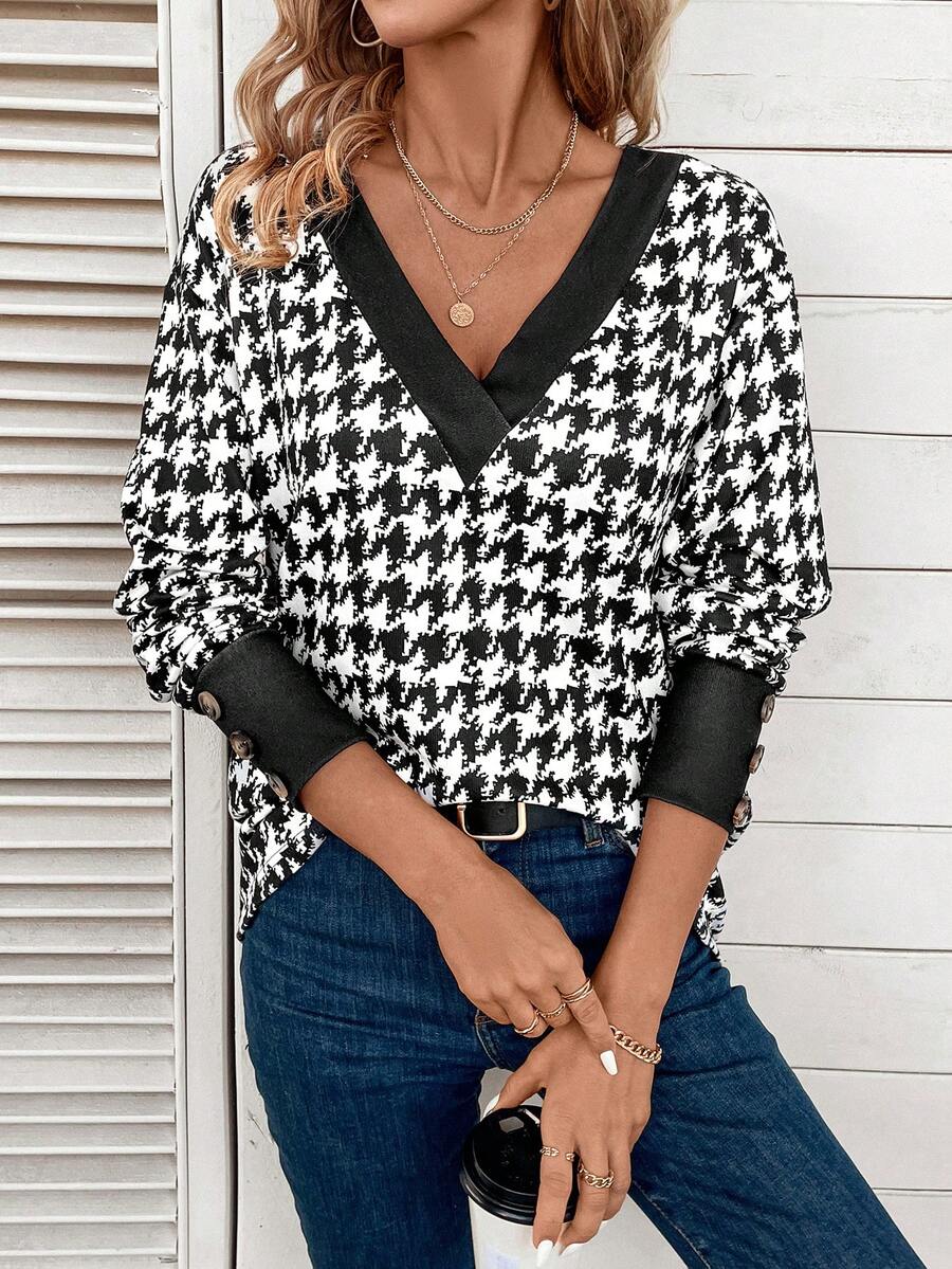 SHEIN LUNE Women's Houndstooth Check Long Sleeve T-Shirt