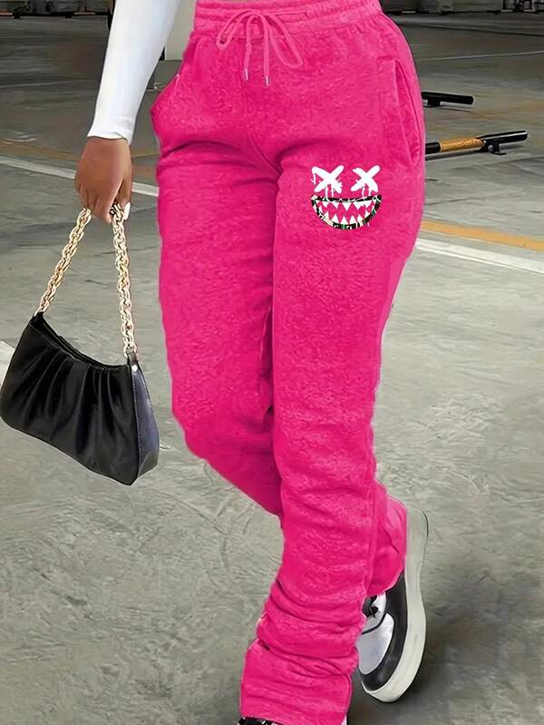 SHEIN Slayr Women'S Jogger Pants With Adjustable Drawstring Waist And Emoticon Print