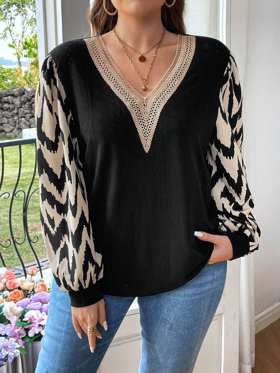 SHEIN Frenchy Women'S Lantern Sleeve V-Neck T-Shirt With Herringbone Pattern