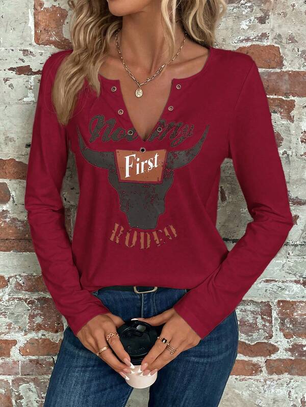 SHEIN Clasi Women'S Letter & Bull Head Printed Long Sleeve T-Shirt