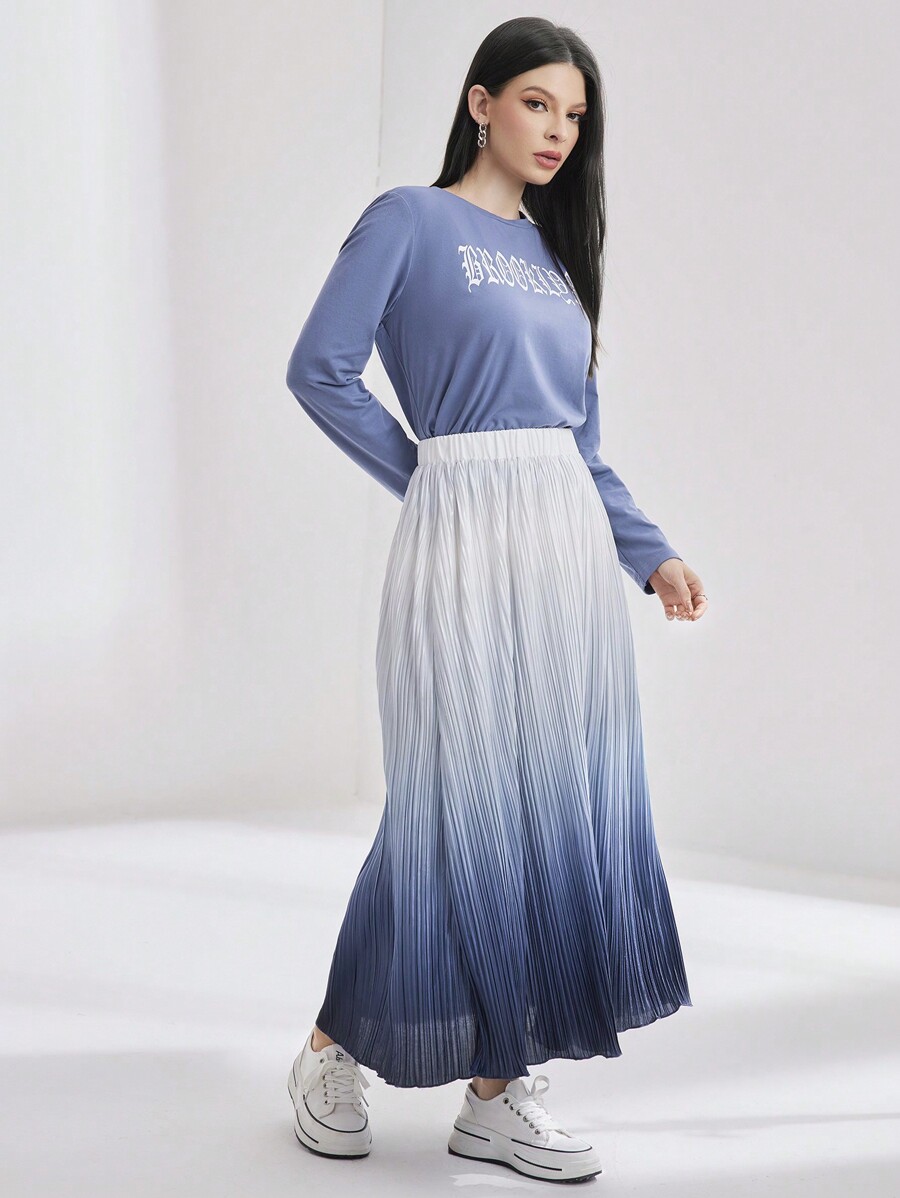 SHEIN Mulvari Women'S Letter Printed Long Sleeve T-Shirt And Ombre Skirt Set