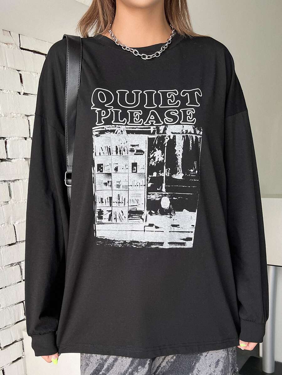 FRIFUL Women's Drop Shoulder Letter Print Long Sleeve T-Shirt