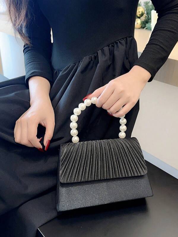 Women'S Luxe Faux Pearl Clutch Evening Bag With Romantic Pleated Design, Square Handbag For Wedding, Party, Formal Event, Bridal Handheld Purse