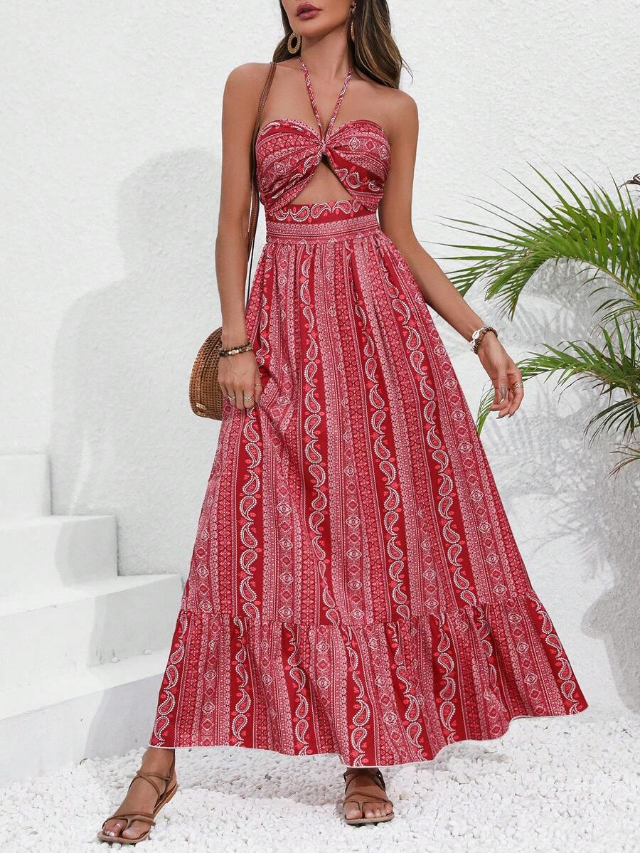 Gothic Sexy Bohemian Travel Halter Valentine's Day Paisley Print Large Skirt Pleats Extra Dress