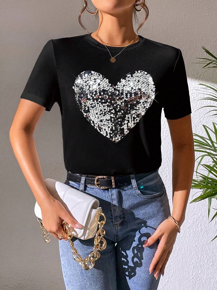 SHEIN Essnce Women's Patchwork Sequin Heart Pattern Short-Sleeved T-Shirt