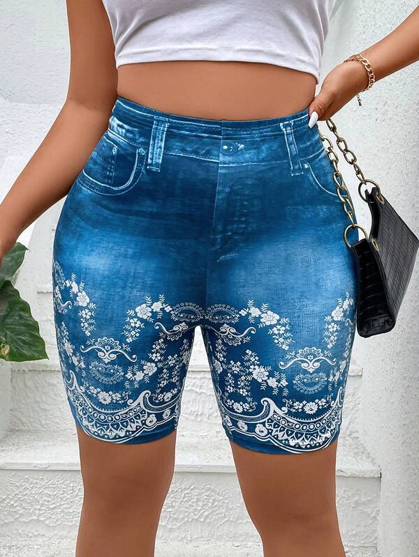 SHEIN Essnce Women'S Plus Size Digital Printed Denim-Look Leggings Shorts