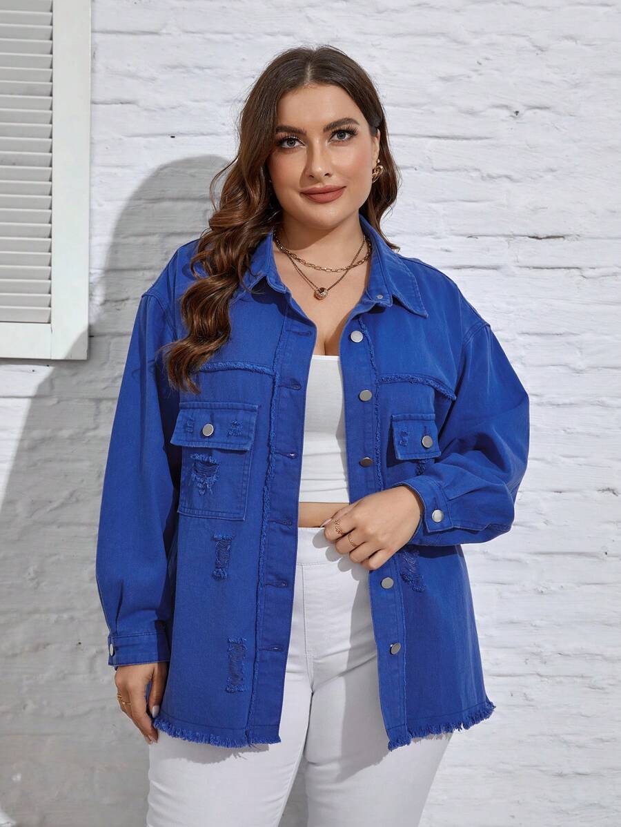 Women'S Plus Size Distressed Fringed Button Front Denim Top