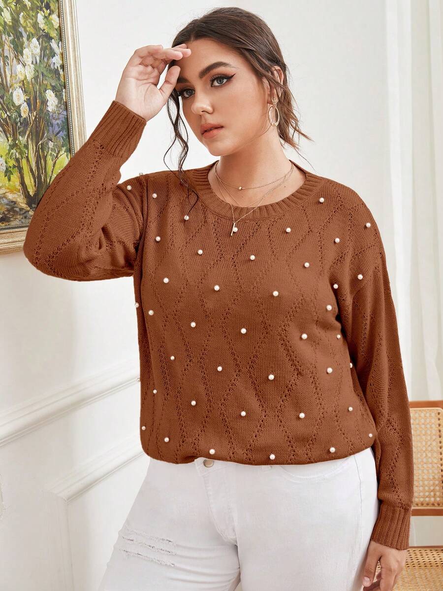 SHEIN LUNE Women'S Plus Size Drop Shoulder Long Sleeve Beaded Sweater