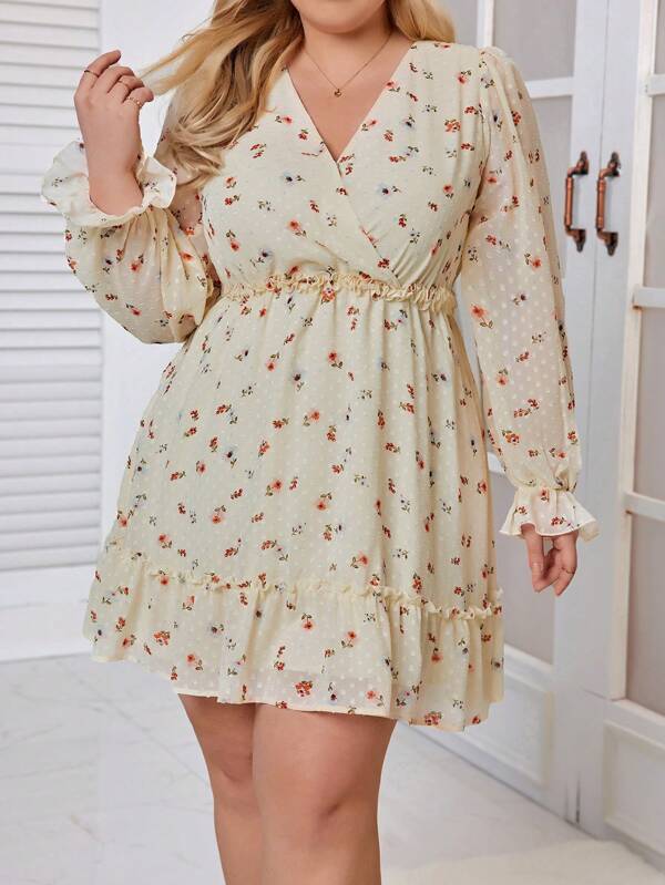 SHEIN Frenchy Women'S Plus Size Floral Print Ruffle Sleeve Empire Waist Dress