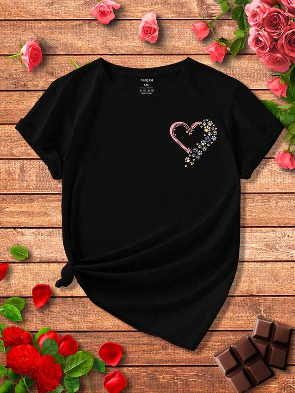 Women'S Plus Size Heart Print Round Neck Short Sleeve T-Shirt