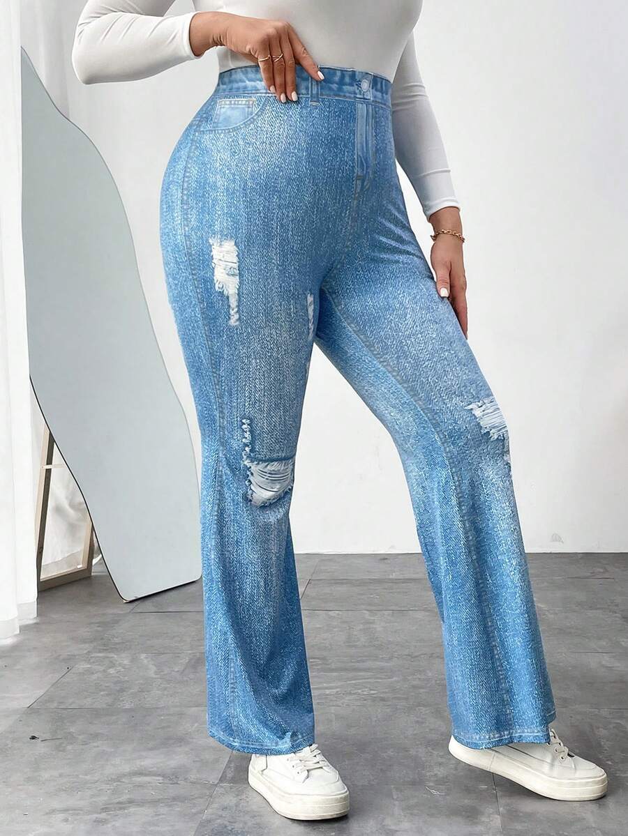 SHEIN Essnce Women'S Plus-Size Printed Flare Pants, Denim-Look