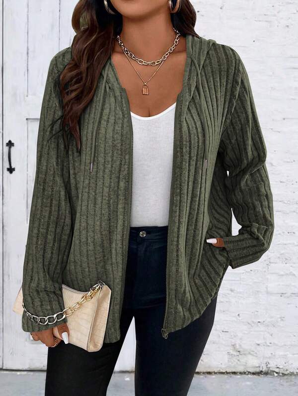 SHEIN LUNE Women'S Plus Size Solid Color Ribbed Zipper Front Hooded Coat
