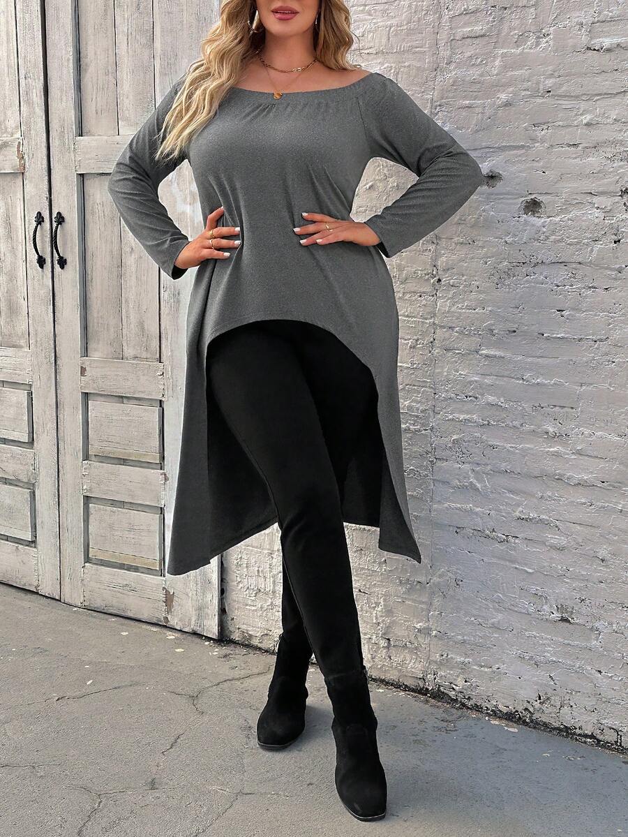 SHEIN LUNE Women'S Plus Size Solid Color Round Neck Asymmetrical Hem T-Shirt