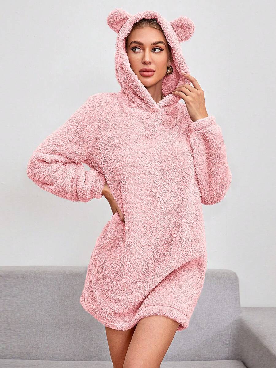 SHEIN Essnce Women'S Plush Hoodie Dress With 3d Ear Decorations