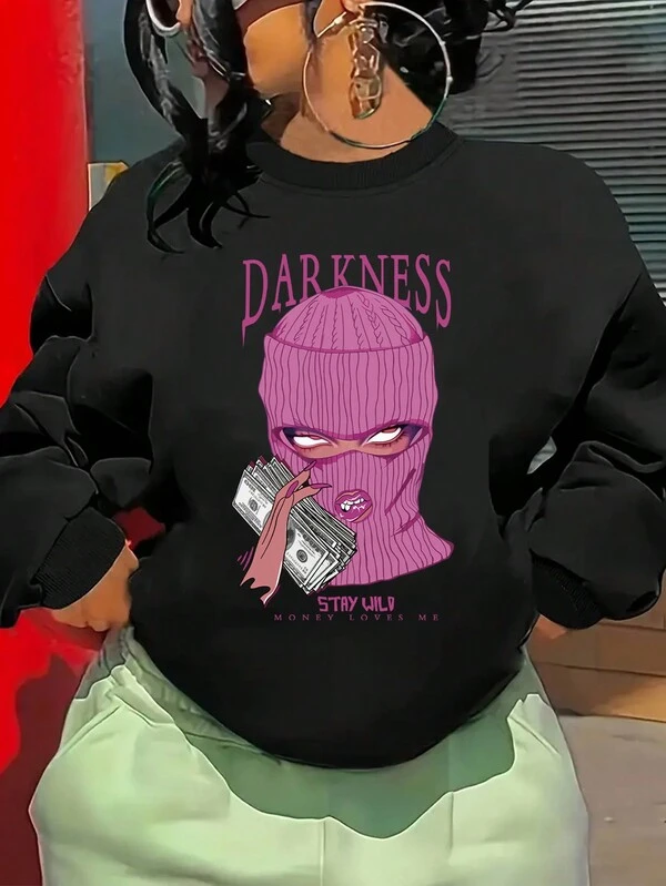 Women'S Round Neck Fleece Hoodie With Letter And Character Print