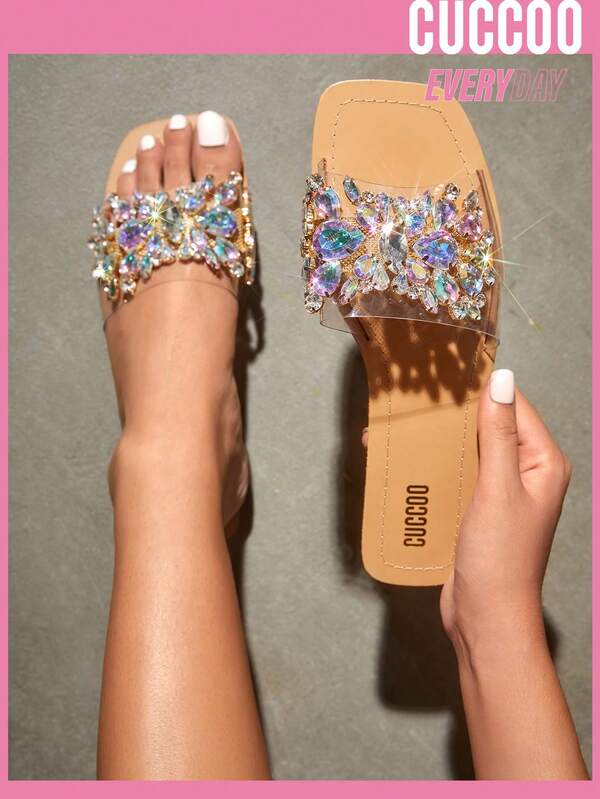 Cuccoo Everyday Collection Women'S Shoes Outdoor Brown Squar Toe Gemstone Decor Single Band Slide Sandals