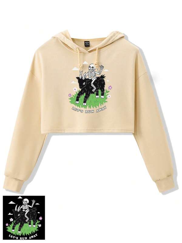 Catsneeze Women'S Skull & Letter Printed Drawstring Hooded Cropped Hoodie
