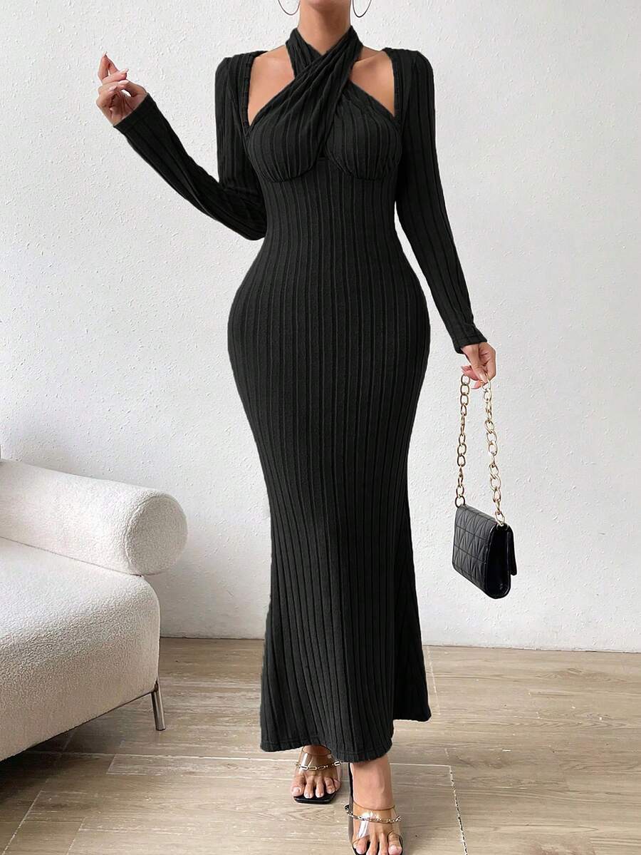 SHEIN Essnce Women'S Solid Color Cross Halter Neck Bodycon Mermaid Dress