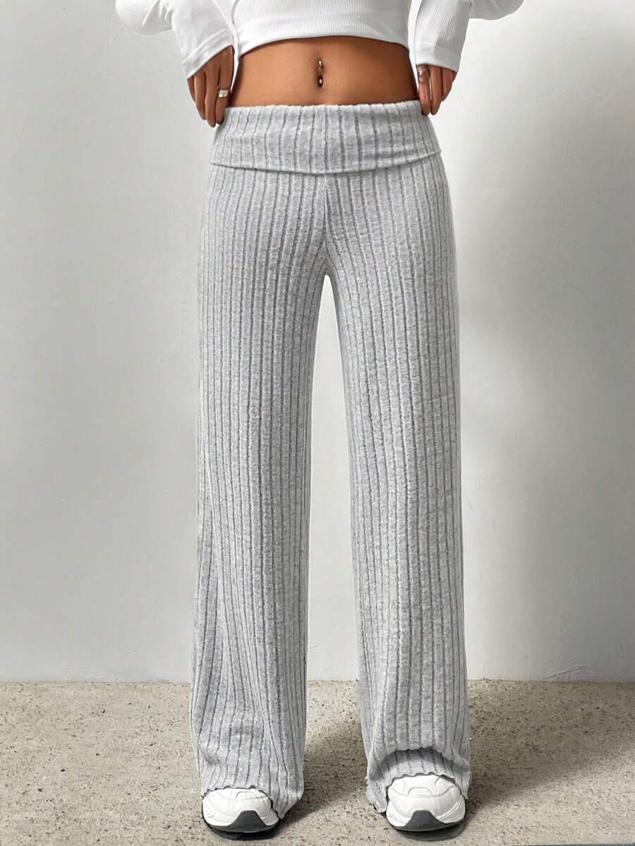 Women'S Solid Color Ribbed Foldover Waist Long Pants