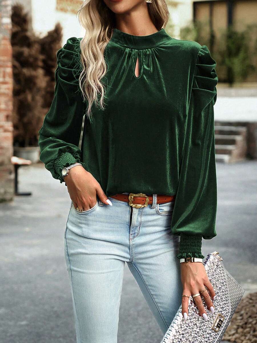 Acelitt Women's Solid Color Stand Collar Leg-Of-Mutton Sleeve T-Shirt