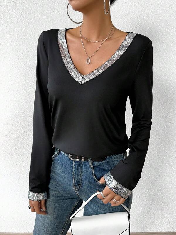 SHEIN Privé Women'S Sparkly Sequin Splicing V-Neck T-Shirt