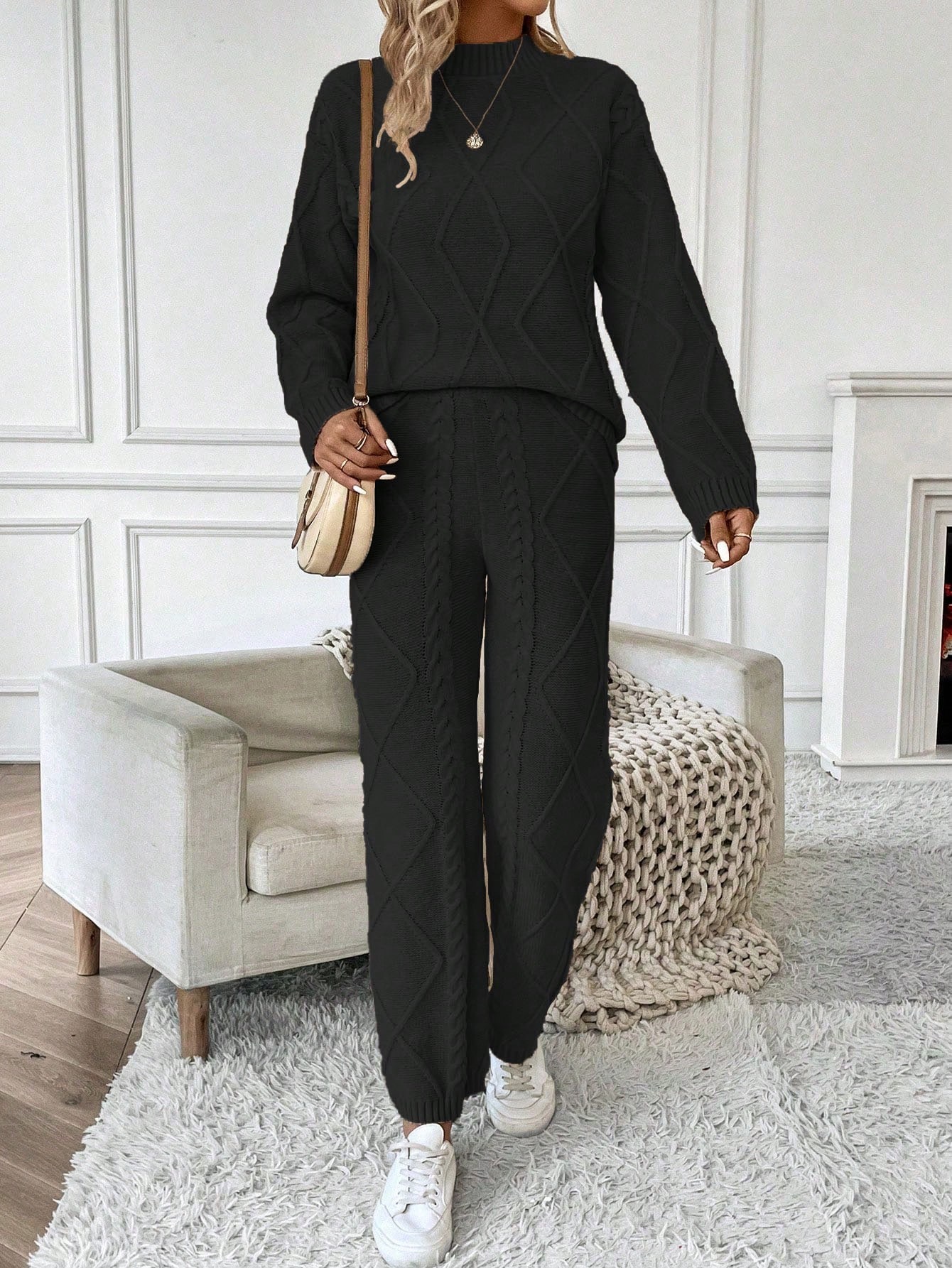 SHEIN Essnce Women'S Stand Collar Long Sleeve Sweater And Sweater Pants Two Piece Set