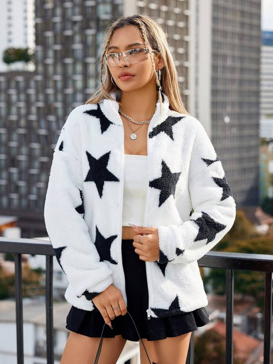 SHEIN Coolane Women'S Star Pattern Zipper Front Jacket