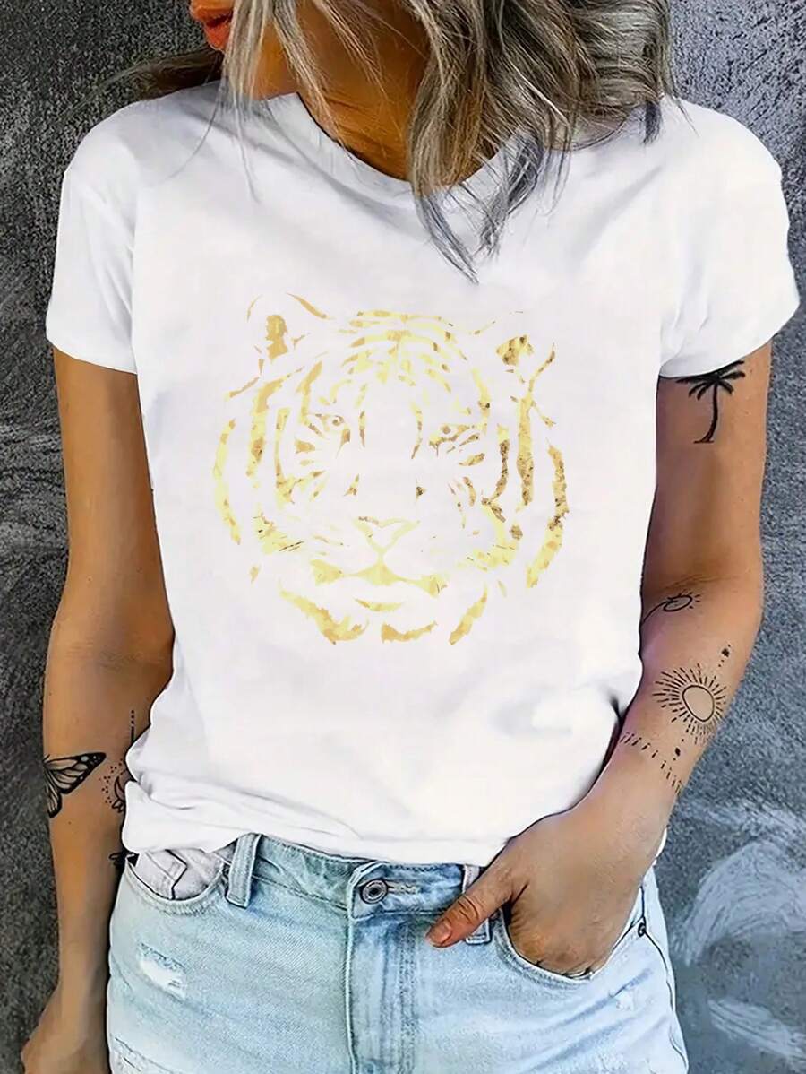 SHEIN LUNE Women's Tiger Foil Print Short Sleeve T-Shirt