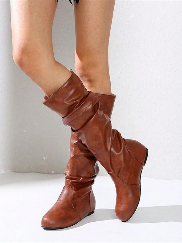 Women's Autumn Fashionable Vintage Medium Top Cowboy Boots With Round Toe And Fold Design Like Knight Boots, Winter