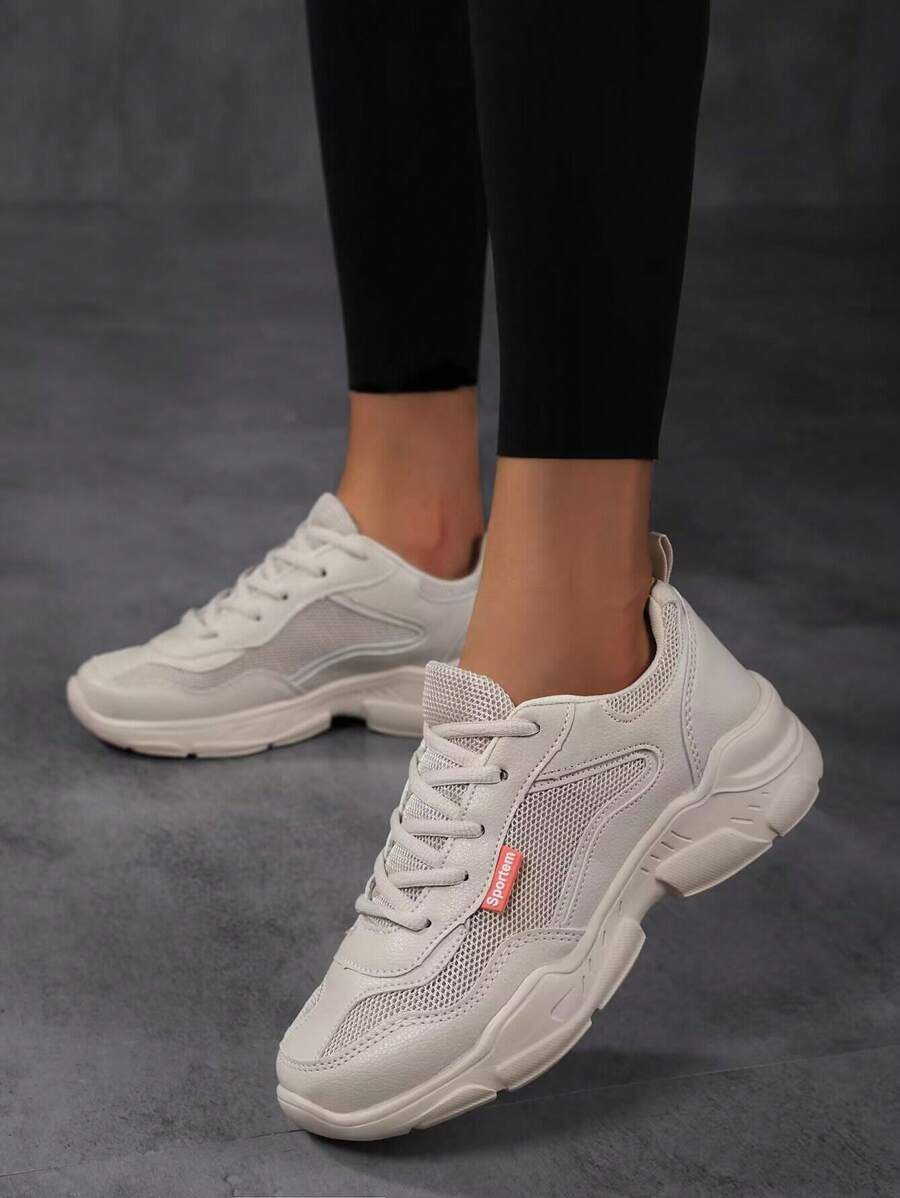 Women's Beige Road Running Shoes, Breathable Mesh Patchwork With Lace-up, Front Foot Sports Sneakers