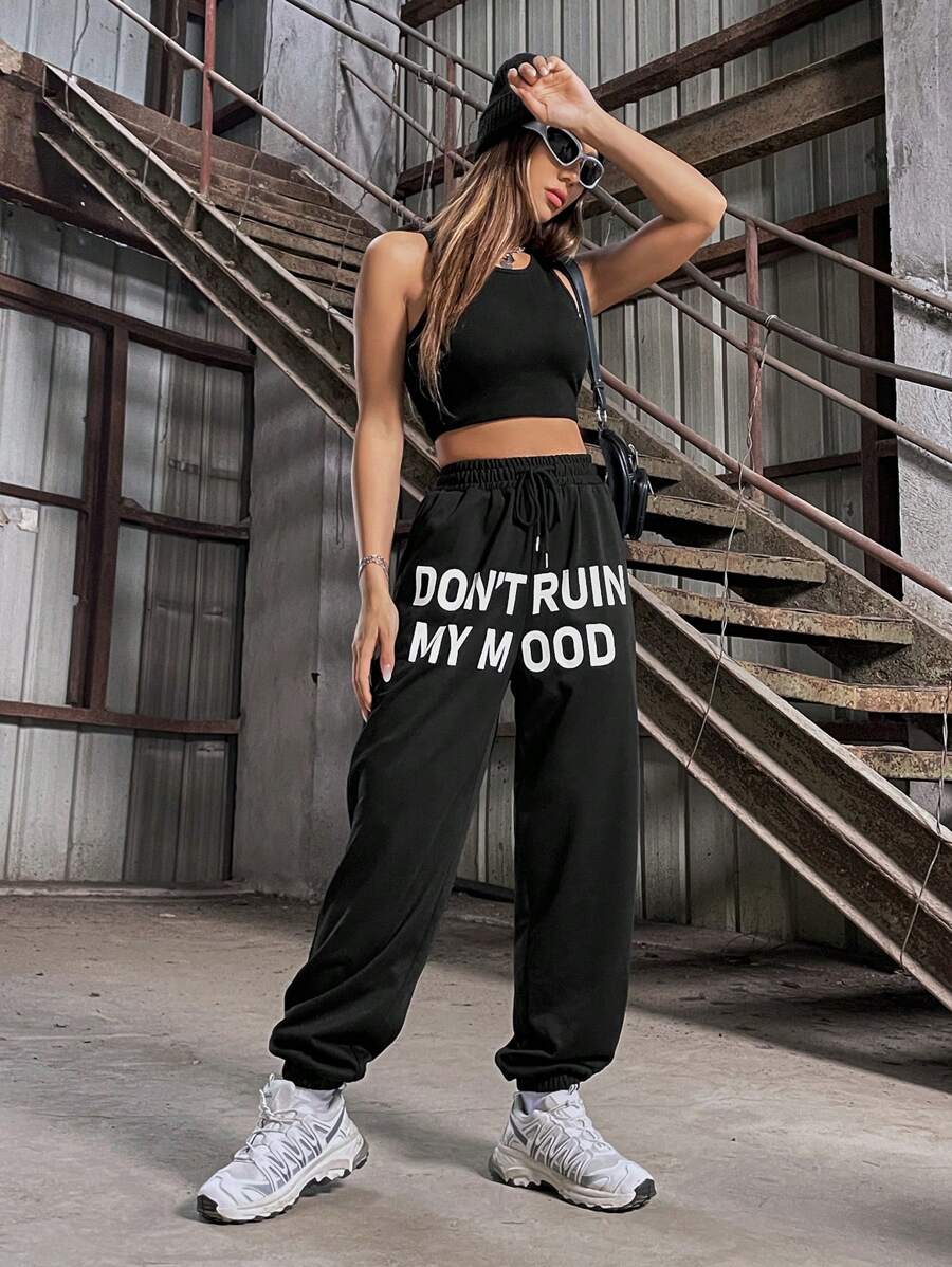 SHEIN Coolane Women's Black Printed Drawstring Waist Jogger Pants
