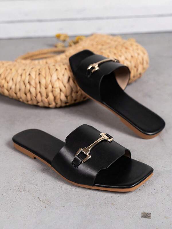 Women's Black Slipper With Metallic Decoration, One Strap, Summer