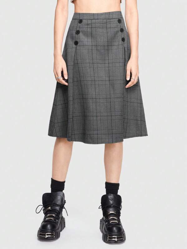 ROMWE Grunge Punk Women's Casual Plaid Button Front A-line Pleated Skirt