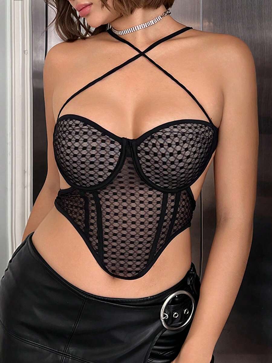 SHEIN ICON Women's Cross Halter Neck Sheer Mesh Hollow Out Tank Top