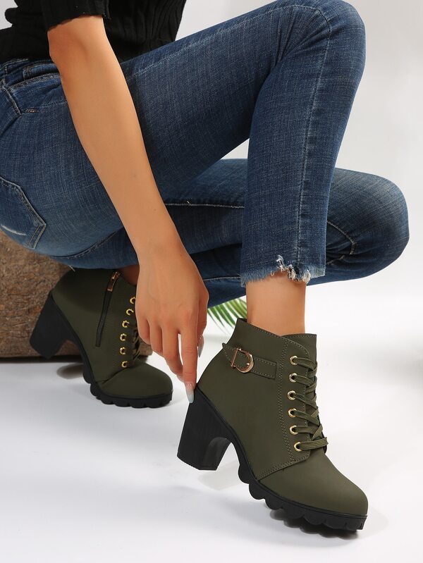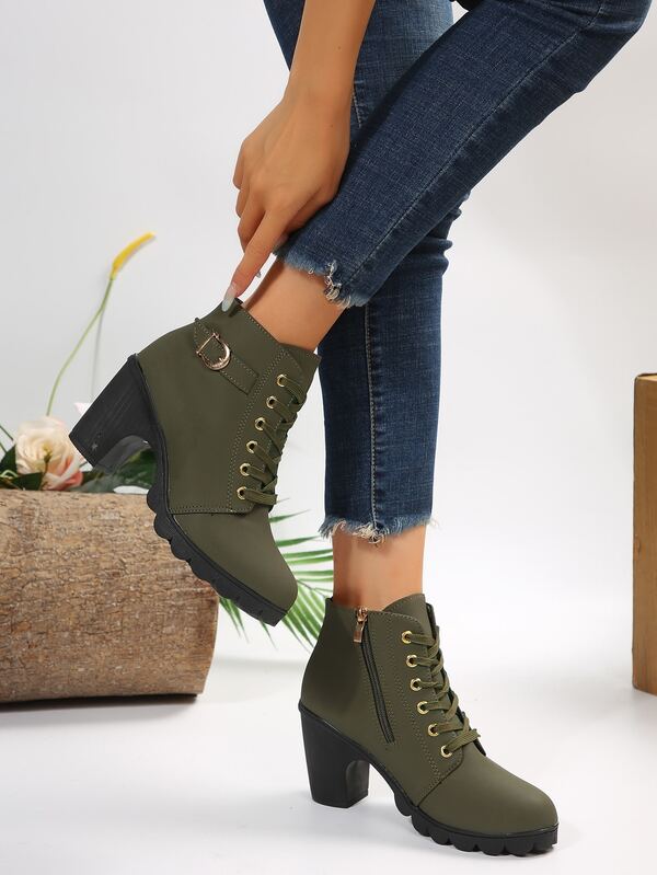 Women's Elegant Black Buckle Strap Decorated Lace-up Chunky Heel Boots
