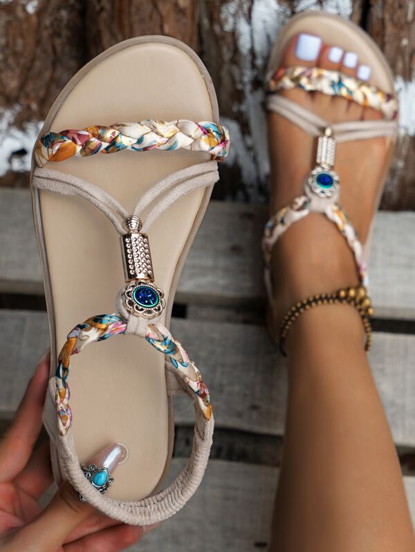 Women's Fashionable & Casual Flat Sandals With Ankle Strap,weaved Details And Rhinestone Decor