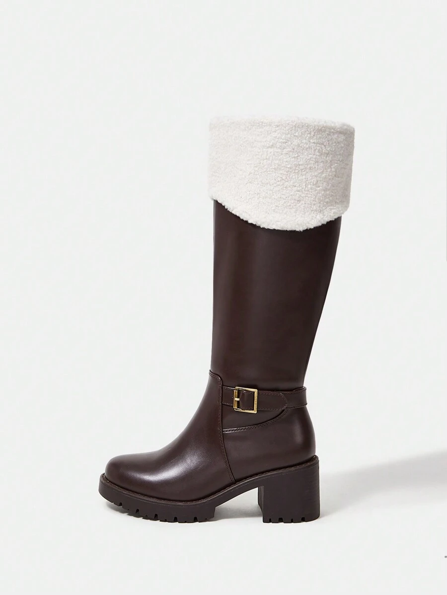 SHEIN MOD Women's Fashionable & Comfortable Brown Buckle Decorated Warm Motorcycle Boots